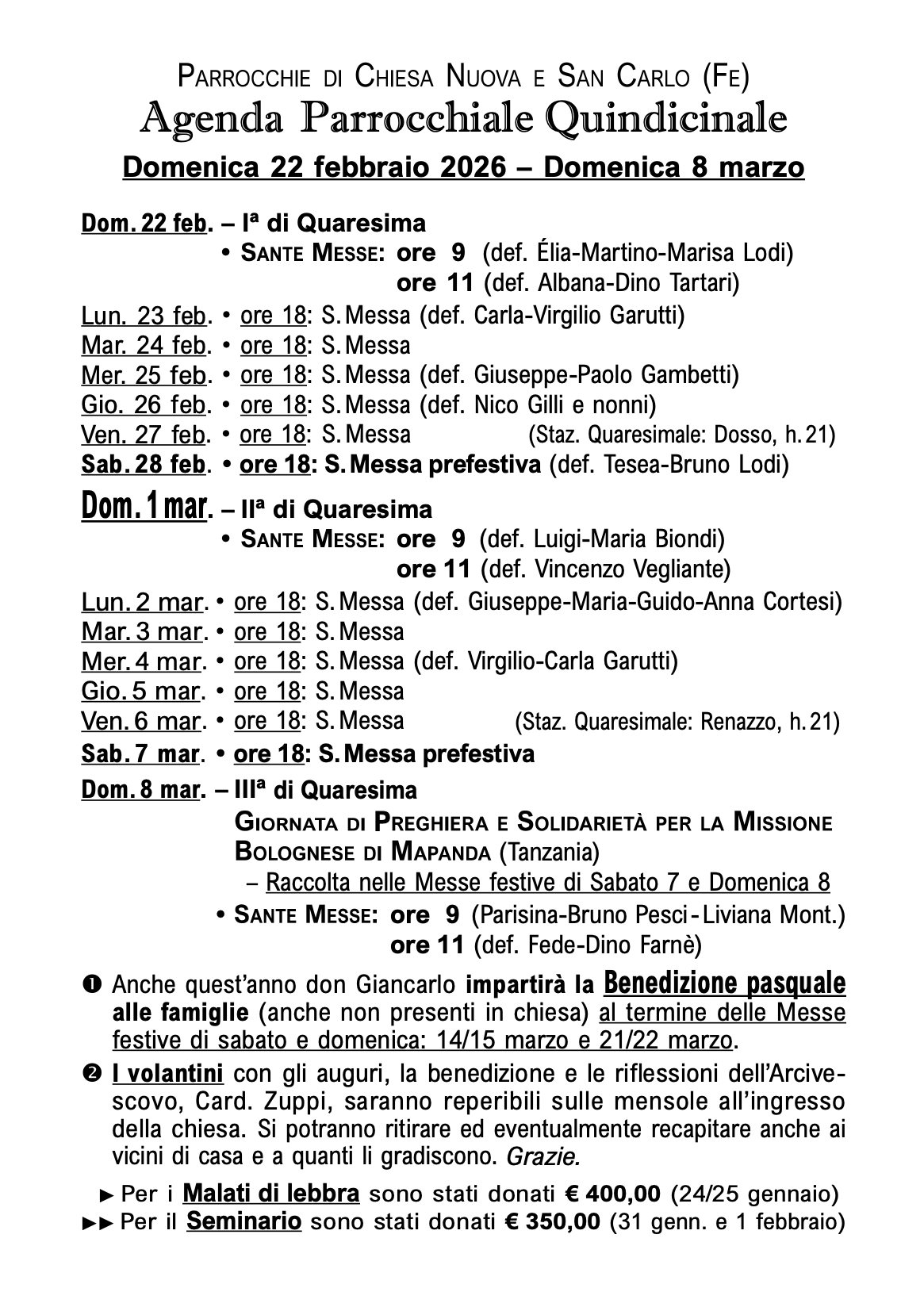 Agenda Parrocchiale dal 22 febbraio all’8 marzo 2026 ← Precedente Prossimo → Agenda Parrocchiale dal 22 febbraio all’8 marzo 2026 Agenda Parrocchiale dal 22 febbraio all’8 marzo 2026